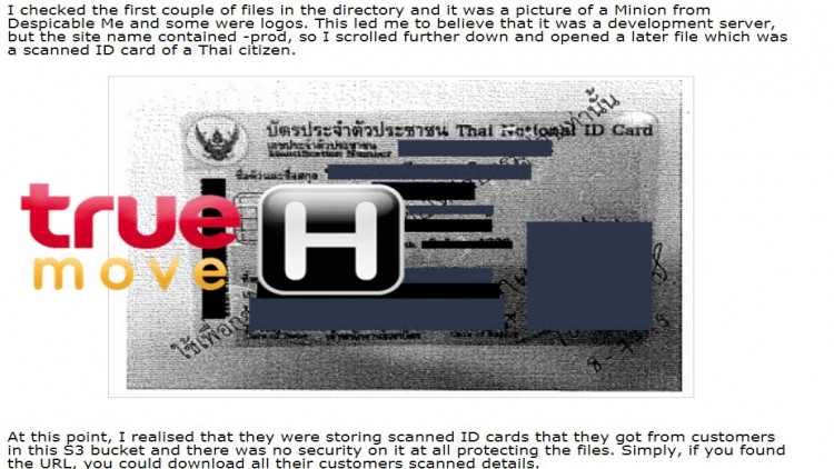 ศุกร์ที่ 13 เมษายนที่ผ่านมา The Register สำนักข่าวเทคโนโลยีในสหราชอาณาจักร เปิดเผยว่า TrueMove H ค่ายผู้ให้บริการเครือข่ายโทรศัพท์ในไทยเผลอทำข้อมูลส่วนตัวผู้ใช้ซึ่งส่วนใหญ่เป็นสำเนาบัตรประจำตัวประชาชน ใบขับขี่ และพาสปอร์ต จำนวนกว่า 46,000 ราย รวม 32 GB หลุดบนคลาวด์เก็บข้อมูล Amazon S3 ตั้งแต่ช่วงเดือนมีนาคมที่ผ่านมา ทำให้ผู้อื่นเข้าถึงข้อมูลชุดดังกล่าวได้โดยไม่มีการป้องกันใดๆ (รวมถึงการดาวน์โหลด)